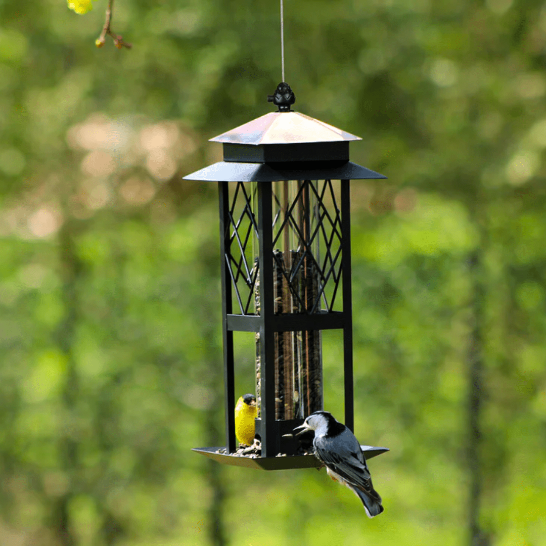 Regular price $39.99The Regal Style Trellis Tube Feeder is a modern tube designed feeder to attract a wide variety of birds to your yard. The black and copper coloured metal construction becomes a great attraction to anyone that sets their eyes on it. This feeder can hold mixed seeds along with black oil sunflower seeds; and welcomes birds like cardinals, chickadees, finches, nuthatches, and woodpeckers.