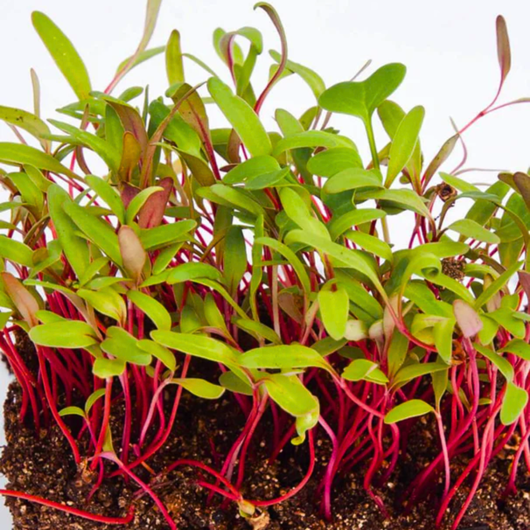 Delicate, pale green leaves atop eye-catching bright red stems. These microgreens are incredibly rich in vitamins K, A, and C. They are also full of protein, dietary fibre, and antioxidants. Learn how to grow microgreens in our online growing instructions below, and take advantage of our special microgreen Swiss chard seeds today.