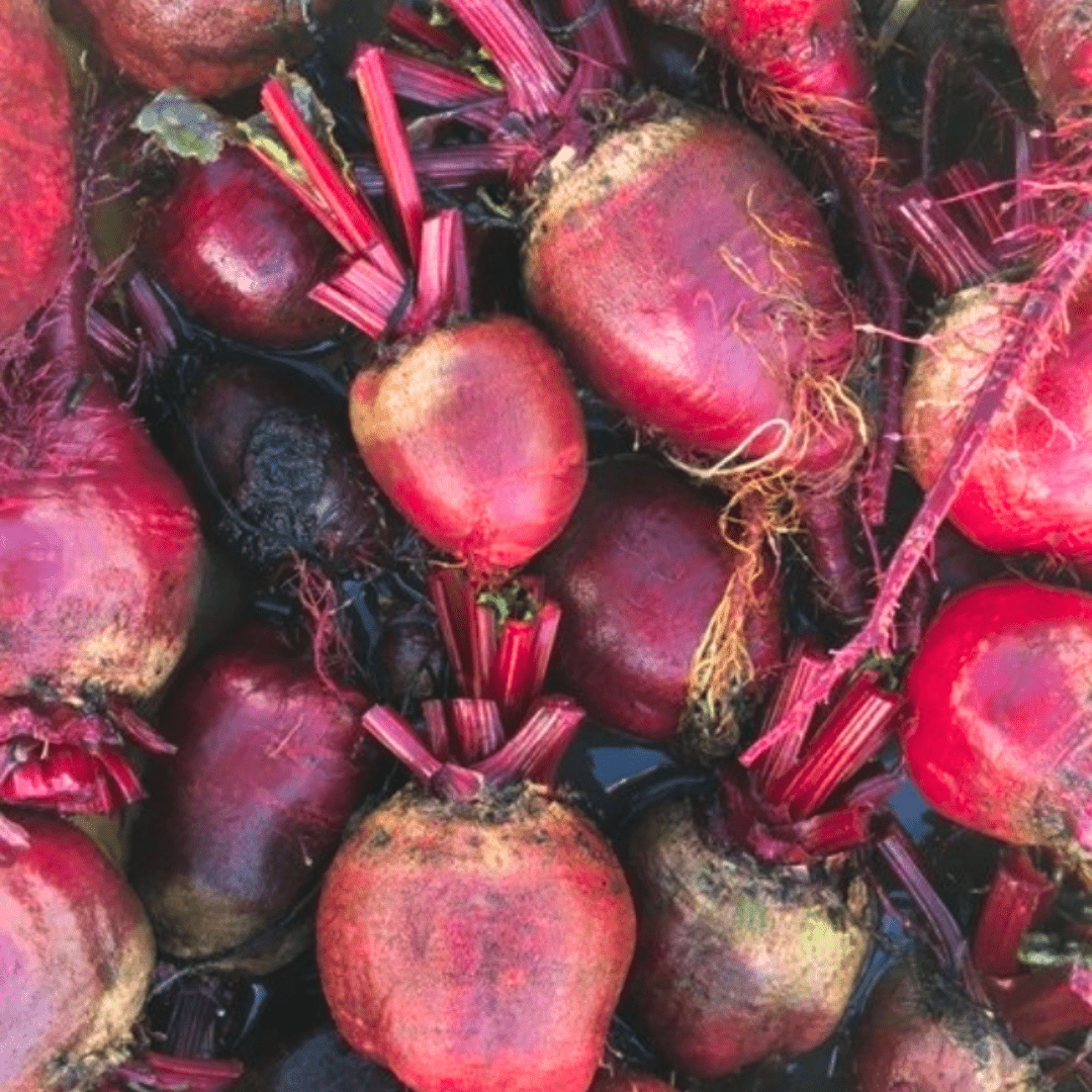 Direct seed 15+ per foot at 1/2" depth in rows 15’’ apart. Thin to one plant every 2” (don’t skip this step!). Beets can be seeded in succession until early July. Amend the soil for big beets.