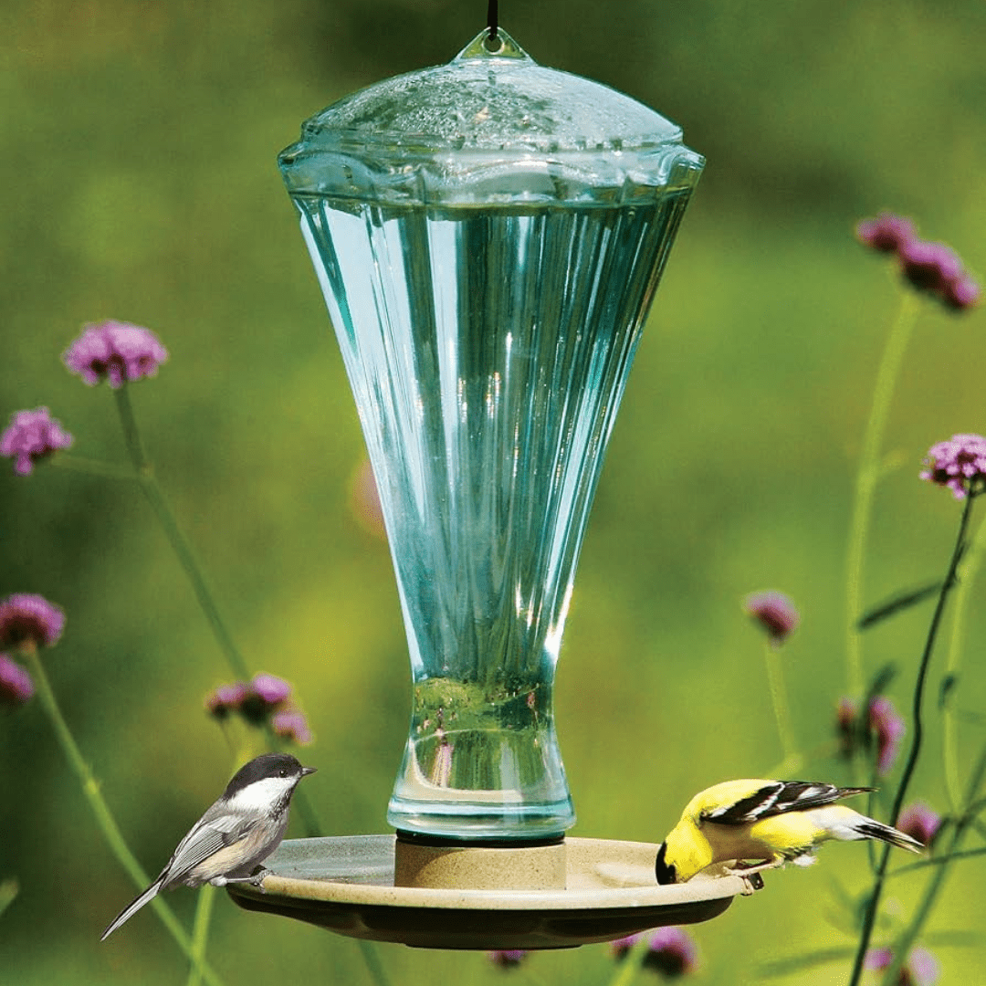Regular price $49.99This unique water feeder holds 64 ounces of water and replenishes fresh water on demand. Durable plastic combination waterer and birdbath with wide-mouth bottle makes filling and cleaning easy. Basin also has a non-slip surface and varying levels allowing birds of all sizes to drink easily. Simply unscrew reservoir to fill or clean. Includes S-hook for hanging.