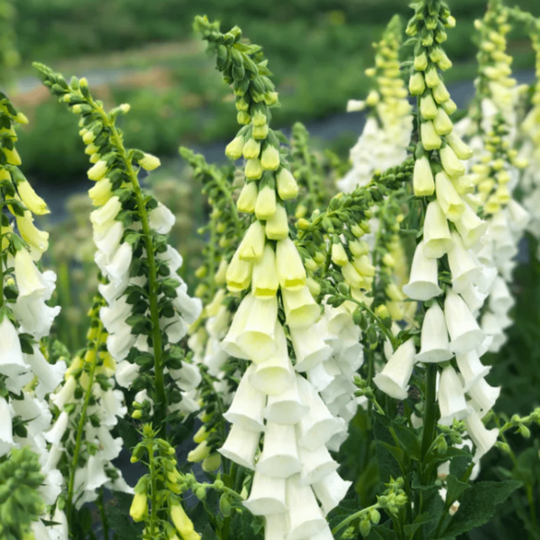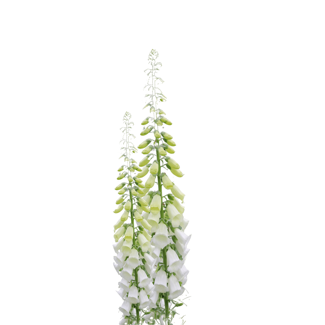 Biennial. A classy cottage-type of foxglove that produces fulll blooms on abundant tall stalks. The white is slightly creamy and un-freckled. Tolerates shade.