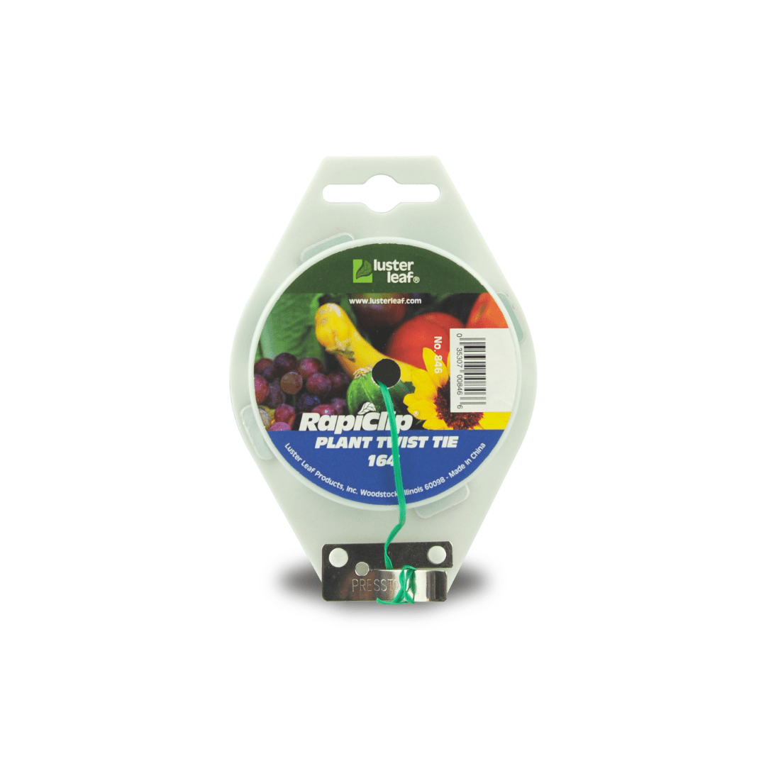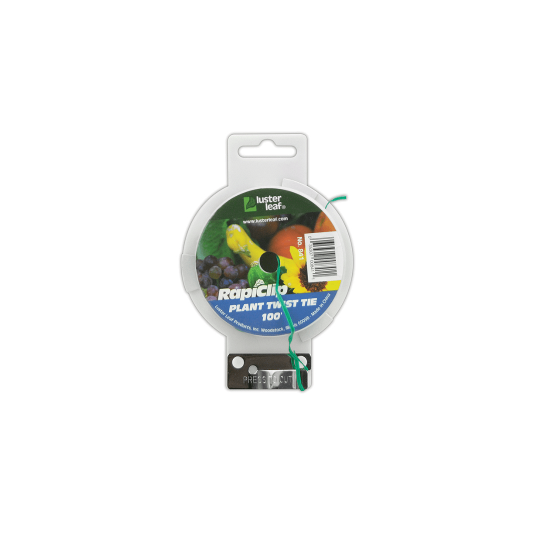 Plastic coated wire twist tie in a dispenser pack with a cutter. For home or garden use.